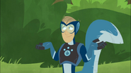 Martin in Gray Squirrel Power holding an acorn next to a gray squirrel