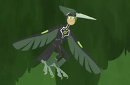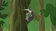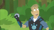 Jimmy preparing to teleport the Woodpecker Power Disc and a woodpecker feather towards Chris