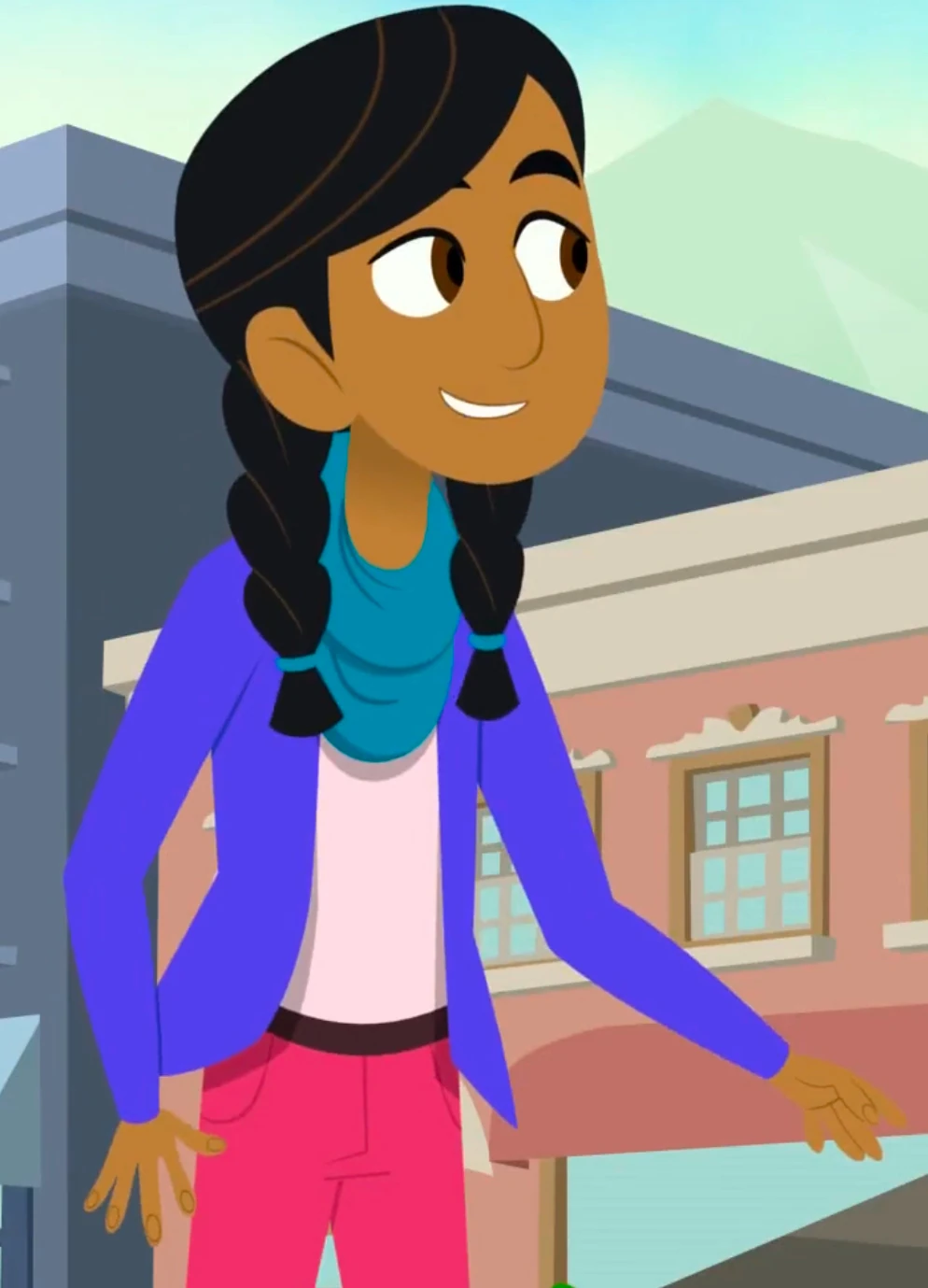 Ava is a young girl with black hair braided into pigtails. She wears a light blue cardigan over a white shirt, a turquoise infinity scarf, light red pants with a black belt, and black flats.