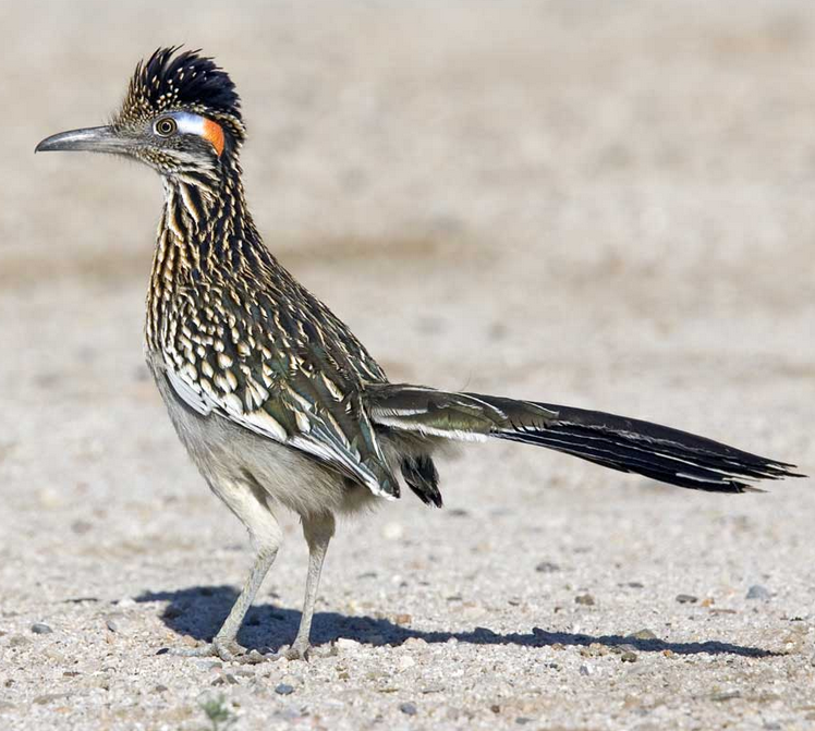 The Greater Roadrunner (Geococcyx californianus) is a long-legged bird in the cuckoo family, Cuculidae, from the Aridoamerica region that inhabits the southwestern United States, including California, Arizona, New Mexico, Texas, and extends into northern Mexico, spanning regions such as Sonora and Chihuahua. Within the genus Geococcyx, the Greater Roadrunner is one of only two species, the other being the Lesser Roadrunner (Geococcyx velox), distinguished by its larger size and broader range. Greater Roadrunners are robust, terrestrial cuckoos native to the Americas, characterized by their sturdy, elongated legs, strong feet with zygodactyl toes (two toes facing forward, two backward), and long, graduated tails. Their plumage is a mottled mix of brown, white, and black, providing effective camouflage in their arid habitats. They possess a distinctive crest on their head and a strong, curved beak suited for capturing prey. As the largest cuckoo species in the Americas, the Greater Roadrunner measures approximately 20–24 inches in length, with a wingspan of 17–24 inches and a weight of 8–19 ounces, making it significantly larger than its counterpart, the Lesser Roadrunner.