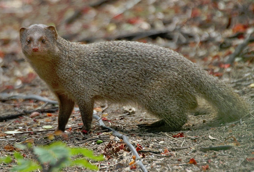 The Indian Grey Mongoose (Urva edwardsii), also called the Indian mongoose or common grey mongoose, is a mongoose species mainly found in West Asia and on the Indian subcontinent. In North Indian languages (Hindi/Punjabi) it is called Nevlaa. The grey mongoose is commonly found in open forests, scrublands and cultivated fields, often close to human habitation. It lives in burrows, hedgerows and thickets, among groves of trees, and takes shelter under rocks or bushes and even in drains. It is very bold and inquisitive but wary, seldom venturing far from cover. It climbs very well. Usually found singly or in pairs. It preys on rodents, snakes, birds’ eggs and hatchlings, lizards and variety of invertebrates. Along the Chambal River it occasionally feeds on gharial eggs. It breeds throughout the year. They have specialized nerve receptors in their body that helps give them a partial immunity to the venom of snakes such as cobras.