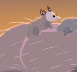 JoJo is an opossum covered with mostly brownish-gray fur. Its limbs are darker than the rest of its body, and the areas around its face are white. Its ears are black with small patches of pink on the inside. JoJo has a long pink tail.