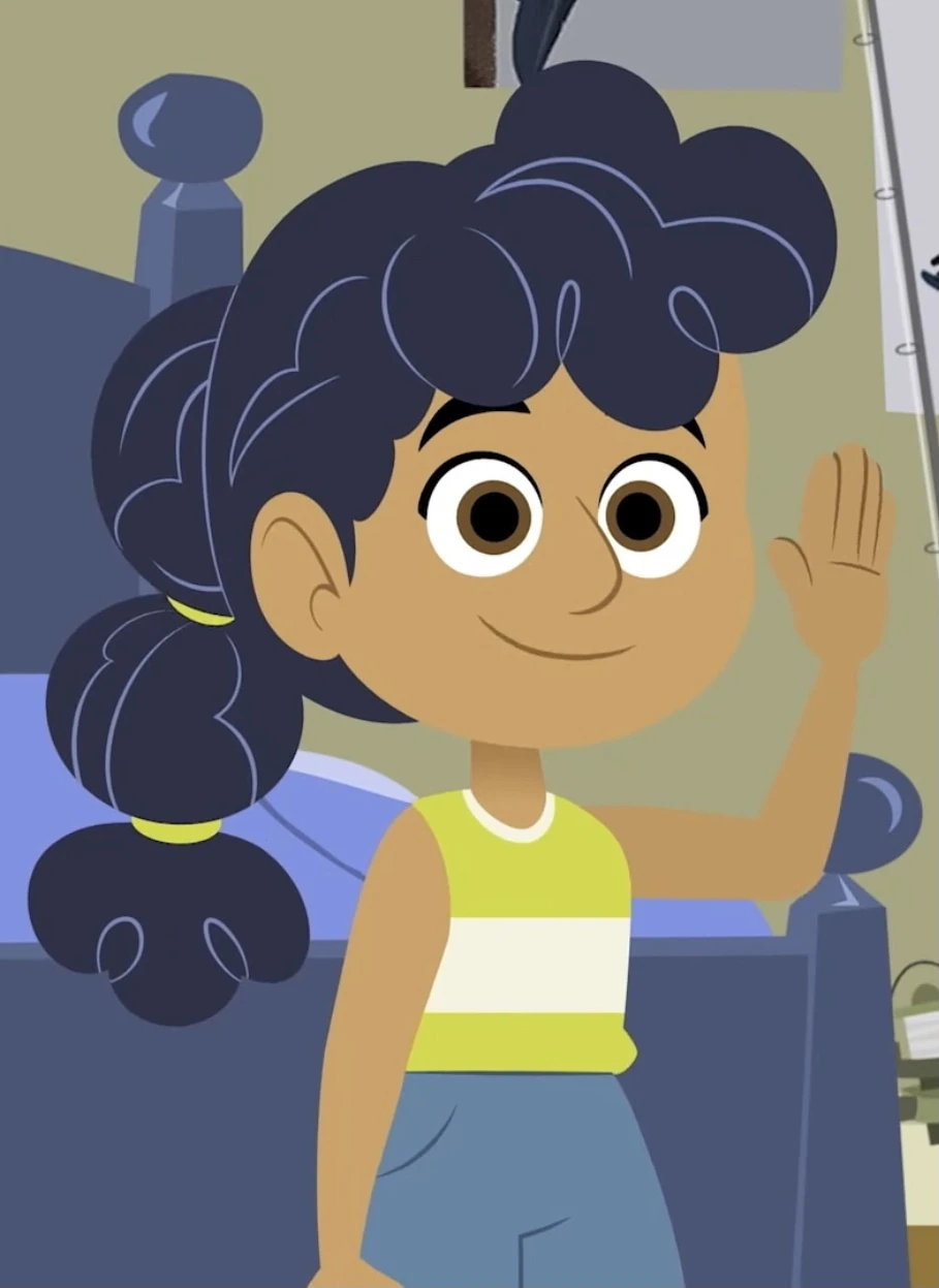 Leah is a slim tan-skinned girl with brown eyes with long and curly navy-blue hair in a twice-braided low ponytail with lime-green hair ties, she wears a white and lime-green striped tank top and denim capris.