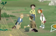 While the Tortuga crew works on the formula for spider silk, the Kratt brothers, miniaturized, watch as Orbit builds a web. Once Orbit finishes, a bee gets stuck on the web. Orbit stuns it and wraps it in her silk. Donita and Dabio also end up stuck in the web, breaking it. At this time, Aviva is able to create a material that mimics orb-weaver spider silk in looks and function. This is enough for the Kratt brothers to activate their Creature Power Suits. Chris makes his move by scaring Dabio, while Martin frees the spiders Dabio had sucked up. Dabio runs away screaming and begs Donita for help, but Donita only gives him her case of captured spiders while she fills up his empty one. The Kratt brothers strike once again and free the spiders. Donita, although angry at Dabio's incompetence, grows suspicious after finding a large string of spider silk on the ground. Later, she disguises her jet as a bird and scares away the Kratt brothers, and begins sucking up the spiders she lost to them. The Kratt brothers try to stop her but are unable to because they have no more material to expel from their nozzles. After Donita leaves, the two see Orbit eating her own webbing, and they realize that orb-weaver spiders can reuse their webbing by eating them, so they begin collecting theirs.