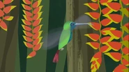The Kratt brothers zip-line from the Central American rainforest canopy down to the Tortuga HQ, where the other Wild Kratts members are sleeping. Martin plays "Wild Kratts Theme Song" on the flugelhorn to wake them up. Aviva and Koki then wake up, and Koki shuts Martin up by shoving a sock up the flugelhorn. The two are mad that they have been woken up, that is until a green-breasted mango hummingbird hovers around them. Their attention turns to the hummingbird's flight capabilities, and they analyze its movements. Martin names the hummingbird Spaceship. The Kratt brothers want to obtain Hummingbird Powers, but in order to do that, they need to touch a hummingbird. The Kratt brothers jump out the Tortuga and run across the forest floor, following Spaceship. Meanwhile, Chef Gourmand is cleaning his airplane restaurant, when he sees a hummingbird fly by. He follows the hummingbird after it flies away from his grasp.